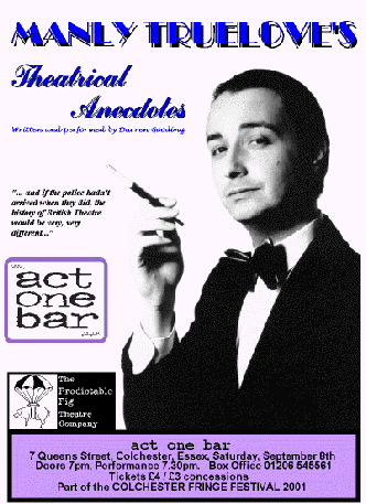 Way back in 2000, whilst freelancing as Arts Correspondent for the Essex County Standard newspaper, Colchester based writer/performer Darren Gooding began devising the comedy character of actor, critic and raconteur Manly S. Truelove. “Manly” finally burst onto the East Anglian Arts Scene in July 2001 in a full length one man stage show entitled Manly Truelove’s Theatrical Anecdotes.
